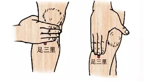 具體做法為:用拇指指面著力于足三里穴位之上,垂直用力,向下按壓,按而揉之。其余四指握拳或張開,起支撐作用,以協(xié)同用力。讓刺激充分達到肌肉組織的深層,產(chǎn)生酸、麻、脹、痛和走竄等感覺,持續(xù)數(shù)秒后,漸漸放松,如此反復(fù)操作數(shù)次即可。